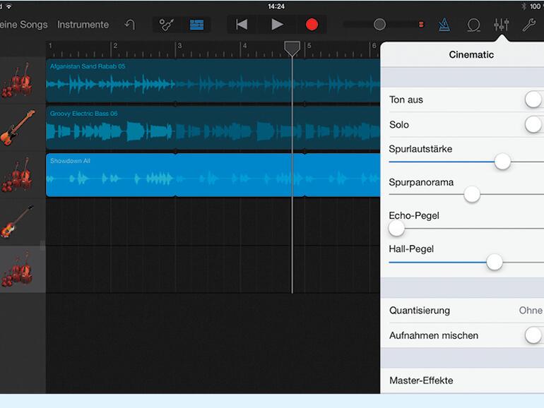 Nach Tipp auf das Spurensymbol erscheint die Spuransicht. Dort arrangieren Sie die Instrumente und setzen Filter ein. Ein Tipp auf Meine Songs sichert die Komposition.