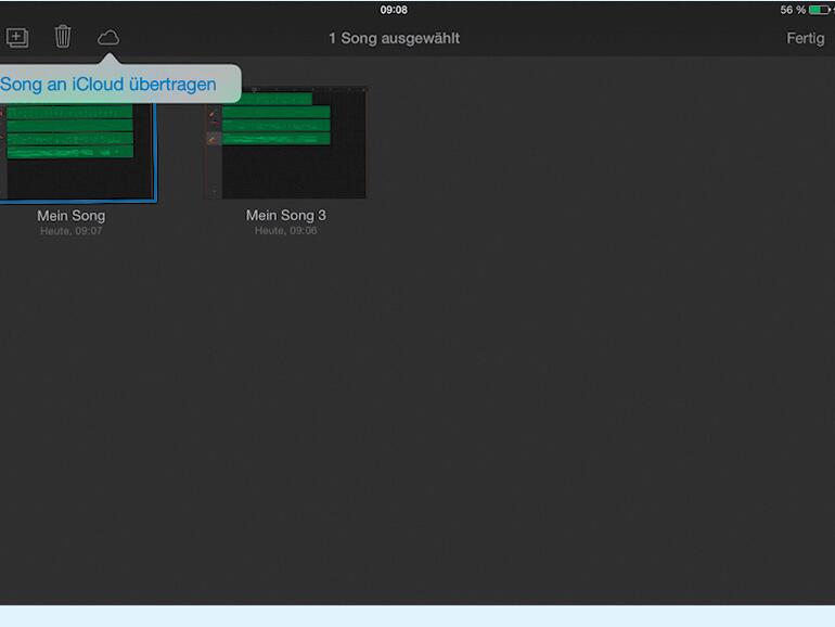Um einen Titel an GarageBand auf dem Mac zu senden, tippen Sie Auswählen. Markieren Sie den Titel und tippen Sie auf die Wolke. Tippen Sie Song an iCloud übertragen.