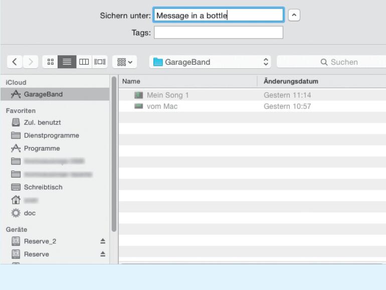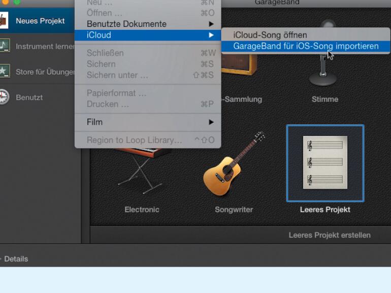Wählen Sie in GarageBand auf dem Mac Ablage im Untermenü iCloud den Eintrag GarageBand für iOS-Song importieren. Wählen Sie den Titel und klicken Sie Importieren.