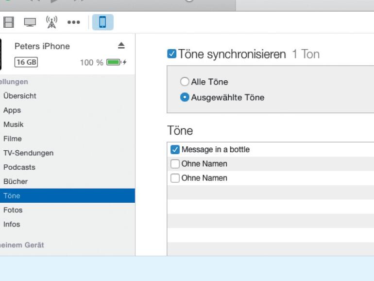 In iTunes wählen Sie Töne synchronisieren. Aktivieren Sie Ihren Ton und klicken Sie Anwenden. Auf dem iPhone wählen Sie den Klingelton unter Einstellungen > Töne aus.