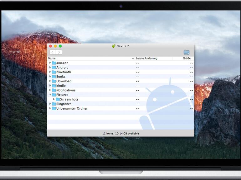 Will man schnell mehrere Gigabyte an Daten auf sein Tablet laden – etwa ein paar Spielfilme für die Urlaubsreise – ist WLAN etwas langsam. Hier ist der Anschluss per USB überlegen. Schließt man ein Android-Gerät per USB-Kabel an den Mac an, passiert allerdings erst einmal gar nichts. Allenfalls Photos oder iPhoto erkennen ein Gerät mit Fotos und bieten den Import in ihre jeweiligen Bibliotheken an. Will man Daten übertragen, muss man nämlich zuerst auf dem Tablet einen USB-Modus namens MTP oder Media Device aktivieren. Die Option findet man unter Android 5 bei „Einstellungen“ > „Speicher“. Hier klickt man oben rechts auf die drei Punkte neben der Suchfunktion und wählt „USB-Verbindung (PC)“ aus. Aktiviert man nun die Option „Mediengerät (MTP)“, kann man mit Spezialtools wie Googles Android File Transfer Daten übertragen. Android File Transfer, auch „Dateiübertragung für Android“ genannt, ist ein sehr simples Tool. Nach dem Start zeigt es unverschlüsselte Ordner auf dem angeschlossenen Android-Gerät an, beispielsweise die Fotos der integrierten Kamera. Eigene Ordner kann man ebenfalls anlegen.