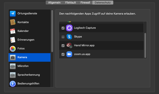 Ärgerlich: Manchmal zeigt die Webcam kein Bild. Das kann ganz verschiedene Gründe bis hin zu defekter Hardware haben – doch oft ist der Grund viel naheliegender: Man selbst hat sich von der Verwendung der Kamera ausgeschlossen. Um die entsprechende Datenschutzeinstellung zu bearbeiten, öffnen Sie zuerst die Systemeinstellungen-Anwendung auf Ihrem Mac. Klicken Sie auf „Sicherheit“ und wechseln in den Reiter „Datenschutz“, um dort „Kamera“ auszuwählen. Hier lässt sich verwalten, welche Apps auf Kameras zugreifen können – hat eine App keine Berechtigung, bleibt das Bild schwarz.