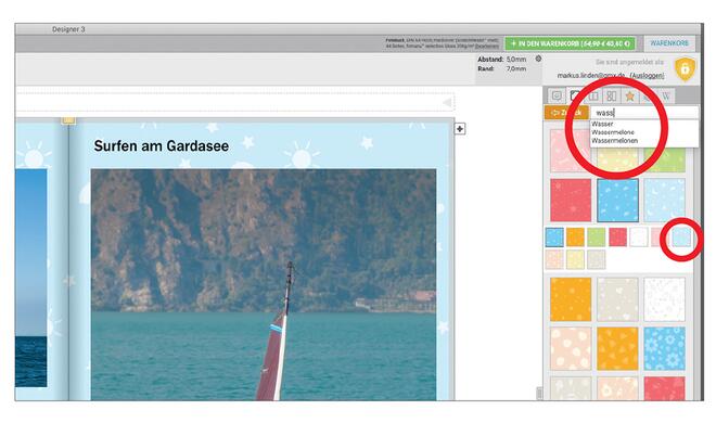 Hintergründe haben einen eigenen Reiter in der Kreativ-Sidebar rechts. Sie sind nach Themen geordnet und viele Hintergründe enthalten noch Variationen, die per Mausklick angezeigt werden. Suchen Sie ein bestimmtes Thema (Fische, Strand, Geburtstag, Wolken etc.), so können Sie passende Hintergründe bequem über die Suche finden. Um den gewünschten Hintergrund zu verwenden, ziehen Sie ihn einfach in die Arbeitsfläche. Sehr bequem dabei: Ziehen Sie den Hintergrund auf den Bund (den Übergang zwischen den beiden Seiten in der Buchmitte), so wird der Hintergrund auf beide Seiten angewendet.