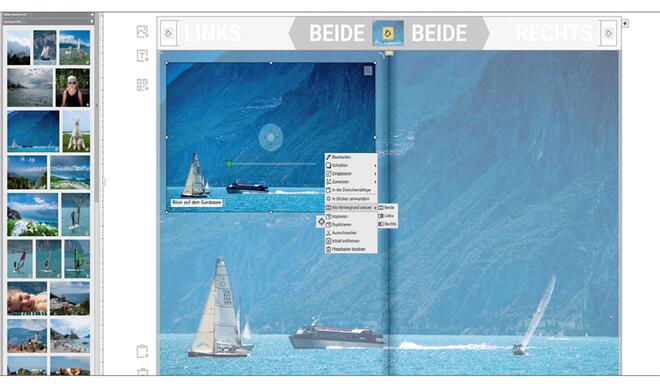 Jedes Ihrer Fotos kann auch als Hintergrund für eine Einzel- oder die Doppelseite eingesetzt werden. Dazu zieht man es entweder auf die Hintergrund-Einstellungen-Zeile (öffnet sich automatisch), oder man klickt ein bereits auf der Seite befindliches Foto mit der rechten Maustaste an und wählt die passende Option.