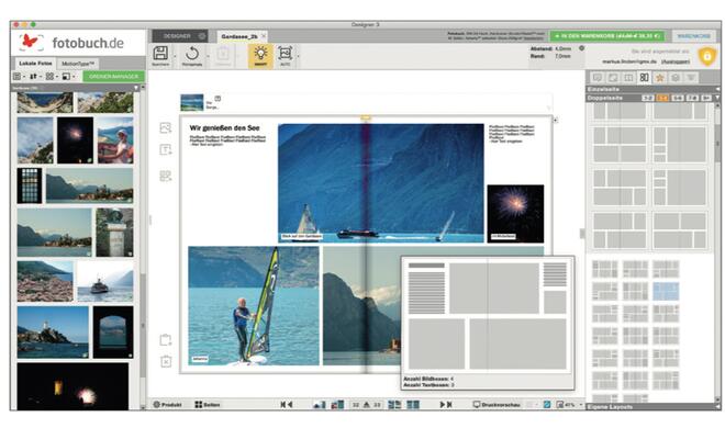 Sie können die Layouts natürlich auch auf Seiten ziehen, die schon Fotos enthalten. Dann berücksichtigt Designer 3 die vorhandenen Bilder und integriert sie in das neue Layout. Einmal auf die Seiten gezogene Layouts lassen sich natürlich individuell anpassen. Und noch besser: Sie können ihre individuelle Seitengestaltung auch als eigenes Layout speichern und so immer wieder neu verwenden.