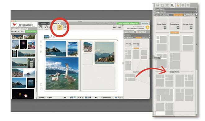 Sie können die Layouts natürlich auch auf Seiten ziehen, die schon Fotos enthalten. Dann berücksichtigt Designer 3 die vorhandenen Bilder und integriert sie in das neue Layout. Einmal auf die Seiten gezogene Layouts lassen sich natürlich individuell anpassen. Und noch besser: Sie können ihre individuelle Seitengestaltung auch als eigenes Layout speichern und so immer wieder neu verwenden.