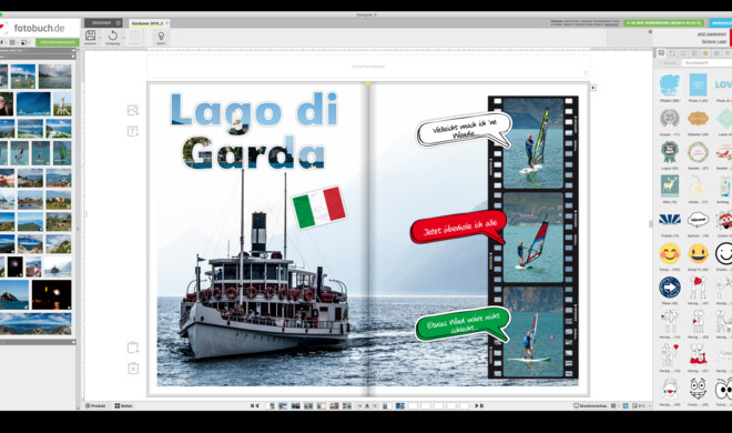 Sticker sind Grafikelemente, die in der Software Designer 3 frei zur Verfügung stehen. Sie anzuwenden, ist kinderleicht: Ein Klick auf den ersten Reiter in der Kreativleiste öffnet eine Übersicht. Sie ist nach Themen gegliedert. Wenn Sie nicht suchen wollen, geben Sie Ihr Thema in das Suchfeld ein – benötigen Sie zum Beispiel eine italienische Flagge, so reicht das Tippen von „Italien Flagge“ aus. Sticker können einfach auf die Buchseite gezogen und wie Fotos auch gedreht, skaliert und frei platziert werden.