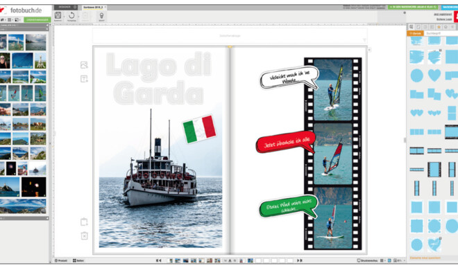 Sticker sind Grafikelemente, die in der Software Designer 3 frei zur Verfügung stehen. Sie anzuwenden, ist kinderleicht: Ein Klick auf den ersten Reiter in der Kreativleiste öffnet eine Übersicht. Sie ist nach Themen gegliedert. Wenn Sie nicht suchen wollen, geben Sie Ihr Thema in das Suchfeld ein – benötigen Sie zum Beispiel eine italienische Flagge, so reicht das Tippen von „Italien Flagge“ aus. Sticker können einfach auf die Buchseite gezogen und wie Fotos auch gedreht, skaliert und frei platziert werden.