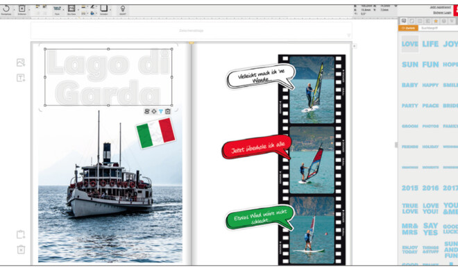 Sticker sind Grafikelemente, die in der Software Designer 3 frei zur Verfügung stehen. Sie anzuwenden, ist kinderleicht: Ein Klick auf den ersten Reiter in der Kreativleiste öffnet eine Übersicht. Sie ist nach Themen gegliedert. Wenn Sie nicht suchen wollen, geben Sie Ihr Thema in das Suchfeld ein – benötigen Sie zum Beispiel eine italienische Flagge, so reicht das Tippen von „Italien Flagge“ aus. Sticker können einfach auf die Buchseite gezogen und wie Fotos auch gedreht, skaliert und frei platziert werden.