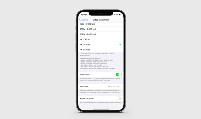 Öffne dazu die Einstellungen-App und rufe „Kamera > Video aufnehmen“ auf. Dort versteckt sich die Option „HDR-Video“. Ziehe den Regler nach links, um sie zu deaktivieren.