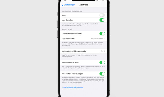Wenn man mehrere Apple-Geräte besitzt, dann gibt es eine praktische Funktion, um alle Apps auf allen Geräten synchron zu halten. Apple erlaubt nämlich, dass jede im App Store erworbene App automatisch auf dein iPhone und iPad heruntergeladen wird. Jedoch möchte man nicht jede App auf dem iPhone oder iPad, weil sie beispielsweise auf dem Bildschirm nicht gut funktioniert. Aus diesem Grund kannst du das Feature auch deaktivieren. Öffne dazu „Einstellungen > App Store“ und ziehe den Regler neben „Apps“ nach links. Darunter kannst du übrigens noch erlauben, ob du Downloads im mobilen Datennetz erlaubst oder ob bei bestimmten Größen gefragt werden soll. Dazu stehen dir in „App-Downloads“ die Optionen „Immer erlauben“, „Fragen, wenn über 200 MB“ und „Immer fragen“ bereit.