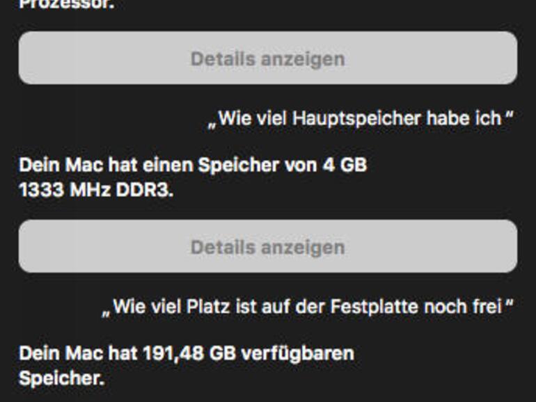 Zu den Fragen, auf die man mit Maus und Tastatur nur eher umständlich eine Antwort bekommt, gehören Informationen über den Mac selbst. Simple Fragen wie „Wie viel Platz ist noch auf der Festplatte?“ werden genau beantwortet und wie bei den meisten Antworten, die Siri gibt, wird auch die Quelle genannt. Klickt man auf „Details anzeigen“, öffnet sich auf die oben genannten Fragen hin „Über diesen Mac“, wo man sich erst ein wenig durchklicken müsste, um seine Antworten zu bekommen. Aber wie immer gilt auch: Siri hat nicht auf auf alles eine passende Antwort und rettet sich gern in eine Web-Recherche, wenn etwas nicht verstanden wird.