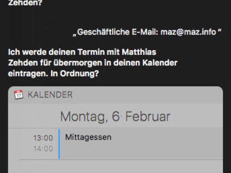 Termine muss man sehr oft genau dann anlegen, wenn man gerade etwas ganz anderes macht. Und da kommt Siri wie gerufen: Der Satz „Neuer Termin Mittagessen mit Matthias am Montag um 13:00“ spart gleich eine ganze Reihe von Mausklicks für das Auswählen der Uhrzeit und die Einladung per Mail. Siri zeigt dabei eine Vorschau auf den einzutragenden Termin, den man meist nur noch bestätigen muss.