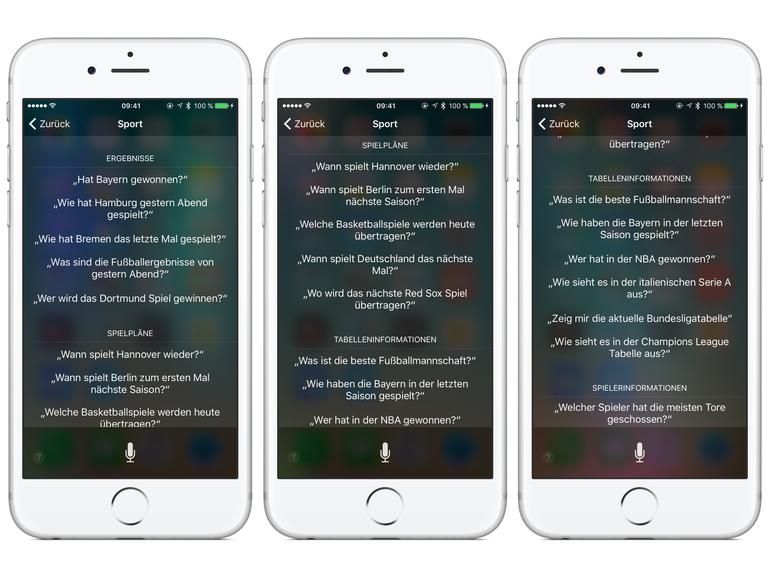 Sir kann man ja bekanntlich auf zwei Arten um Hilfe bitten. Entweder sagt man einfach "hey Siri" (iPhone 6s/iPhone SE) oder man hält kurz den Home-Button gedrückt, bis die Sprachassistentin erscheint. Im Sport- und Fussballbereich kann Siri sogar etwas mit Abkürzungen und natürlicher Sprache anfangen. So erkennt sie auch die Frage, ob "die Bayern gewonnen haben". Neben Fussballergebnissen zeigt sie auf Wunsch auch Tabellen an, gibt Prognosen zu zukünftigen Spielen, weiß über den Spielplan Bescheid und kann sogar einfache Fragen zu einzelnen Spielern beantworten.
