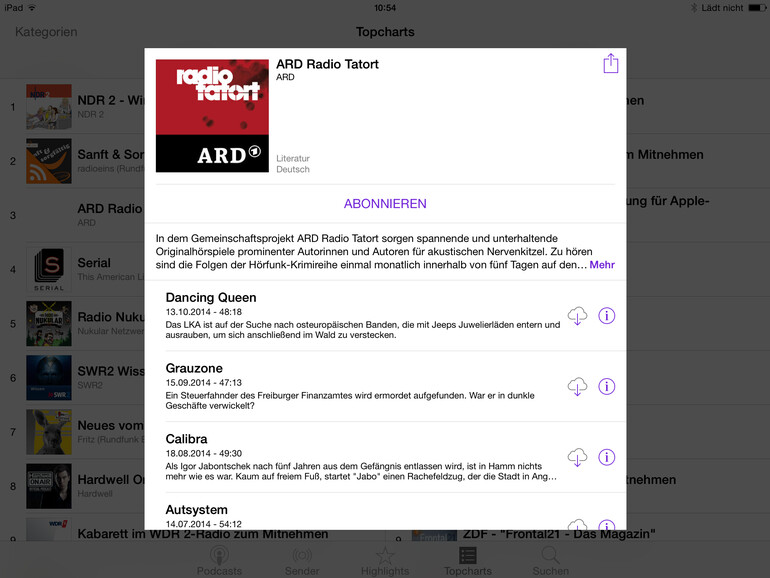 Um einen davon zu abonnieren, tippen Sie auf Namen oder Symbol und im sich öffnenden Fenster auf den Schalter „Abonnieren“. Daraufhin erscheint unten zusätzlich der Navigationseintrag „Downloads“. Dieser verschwindet wieder, wenn das Laden eines oder mehrerer Beiträge abgeschlossen ist. Alle geladenen Podcast-Beiträge finden Sie unter dem Schalter „Sender“, sämtliche Abonnements unter dem Schalter „Podcasts“. Möchten Sie ein Abonnement beenden, tippen Sie im Bereich „Podcast“ oben links auf „Bearbeiten“ und anschließend auf das Löschsymbol oben links an einem Podcast-Symbol.