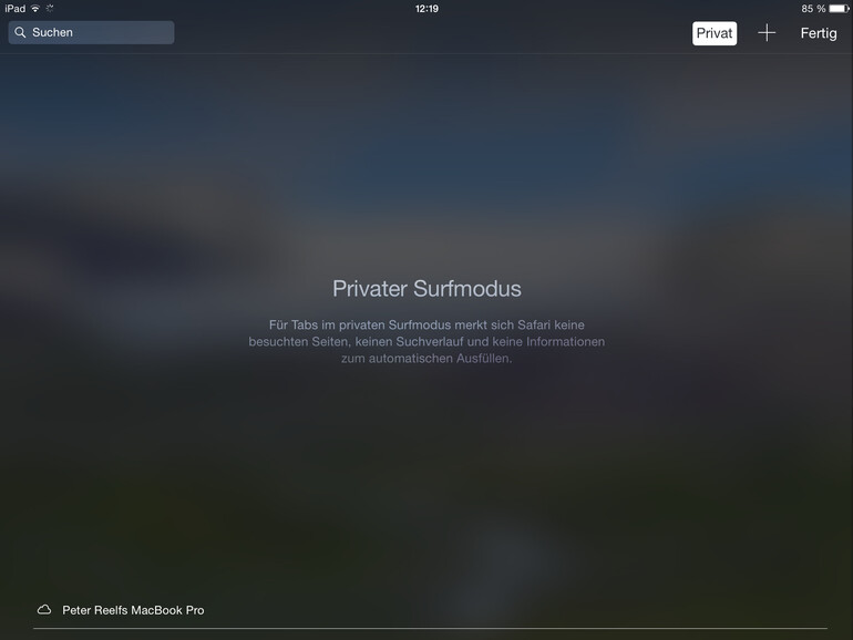 Es auch möglich, privates Surfen nur auf einige Webseiten zu beschränken und zeitgleich Internetseiten im normalen Modus aufzurufen. Öffnen Sie dazu ebenfalls die Miniaturseitenansicht. Ist „Privat“ aktiviert, wird auch jeder andere Tab, den Sie hier durch Druck auf das Plus-Symbol anlegen, im Privatmodus bleiben. Möchten Sie jedoch einen oder mehrere Tabs im Normalmodus öffnen, tippen Sie auf „Privat“ und danach auf das Plus-Symbol. Sämtliche Tabs, die Sie ab jetzt anlegen, verwenden den Normalmodus. Zwischen allen geöffneten privaten und öffentlichen Tabs schalten Sie im Miniaturmodus mit der Taste „Privat“ hin und her.