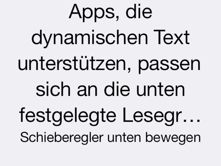 Die Lesbarkeit der Bildschirmmenüs und längerer Text dürfte sich dank dynamischer Textgrößen sichtbar verbessern. Wählen Sie über den Schieber Ihre Buchstabengröße unter Einstellungen › Allgemein › Textgröße. Sobald in einer App für einen Menüpunkt oder auch Fließtext mehr Patz zur Verfügung steht, passt sich der Text an und wird in Ihrer Wunschgröße angezeigt. Alle Apps von Apple unterstützen diese Funktion. Auch App-Entwickler können die automatische Anpassung von Schriftgrößen in Ihren Apps integrieren. Hier kommt es auf einen Praxistest an, wer die Funktion bereits unterstützt. Sollte die Schriftgröße immer noch nicht ausreichen, können Sie es mit der Zoom-Funktion versuchen. Berühren Sie mit drei Fingern den Bildschirm, wird ein Teil der Bildschirminhalte vergrößert. Nach einer zweiten Berührung mit drei Fingern kehren Sie zur Normal-Darstellung zurück. Diese Option aktivieren Sie unter Einstellungen › Allgemein › Bedienungshilfen › Zoom.