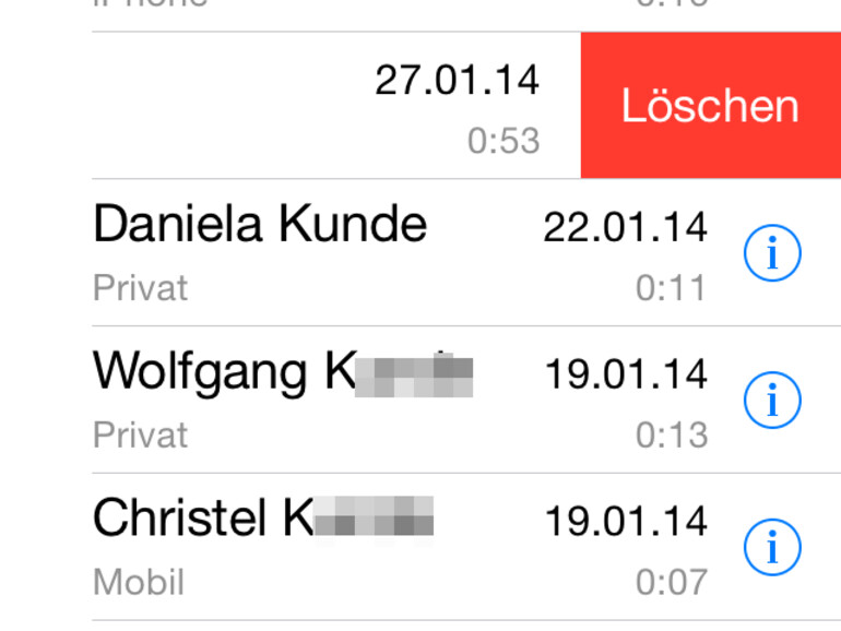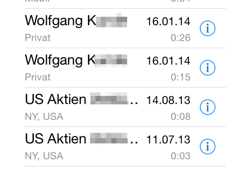 Ein Fingertipp auf den blau-weißen Pfeil am rechten Rand öffnet den kompletten Eintrag zur Rufnummer bzw. zum Namen. Ist der Anrufer im Adressbuch verzeichnet, sehen Sie sämtliche Kontaktdaten.