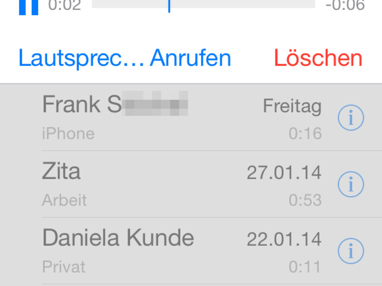 Ein Fingertipp auf den Namen oder die Nummer startet die Wiedergabe der Sprachnachricht. Unten zeigt Ihnen ein blauer Fortschrittsbalken, wie lang die Nachricht ist und an welcher Stelle Sie sich gerade in der Wiedergabe befinden. Wenn Sie eine Passage noch einmal hören möchten, schieben Sie den Wiedergabepunkt mit dem Finger vor oder zurück. Anhalten können Sie die Wiedergabe mit dem Pause-/Play-Zeichen links neben dem Namen bzw. der Rufnummer. Oben rechts aktivieren Sie den Lautsprecher, um die Nachricht abzuhören, ohne das iPhone am Ohr zu haben. Das funktioniert auch mit einem angeschlossenen Bluetooth-Headset oder einer Freisprech-Einrichtung im Auto.