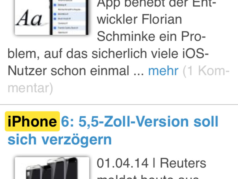 Schieben Sie die Trefferliste mit dem Finger etwas nach oben, sodass Sie den Eintrag „Auf dieser Seite“ sehen. Hier steht bereits die Anzahl der Fundstellen. Tippen Sie auf das Suchwort; die erste Fundstelle wird gelb unterlegt angezeigt. In der unteren Menüleiste tippen Sie auf den rechten Pfeil, um zur nächsten Fundstelle zu gelangen.