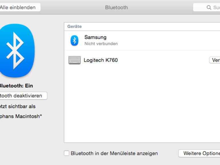 2. Je nach Gerät müssen Sie dort eine bestimmte Tastenkombination drücken oder einen Schalter etwas länger gedrückt halten. Nach einer Weile taucht dann das Gerät in der Liste auf. Dabei muss nicht immer gleich ein Gerätename zu lesen sein, achten Sie auf das Symbol vor der Bezeichnung. Der Mac sollte zumindest schon einmal korrekt erkannt haben, was Sie mit dem Gerät steuern wollen.
