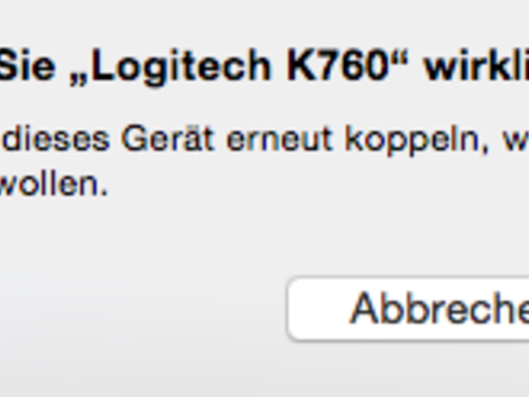 Der Mac fragt nach, ob Sie es tatsächlich entfernen wollen. Bestätigen Sie dies. Bei den meisten Geräten drücken Sie dann den Ein-/Aus-Schalter für eine längere Zeit, um das Pairing erneut aufzurufen. So auch bei der Apple-Tastatur, die das mit einem eifrigen Blinken beantwortet. Dann beginnt die Kopplung erneut.