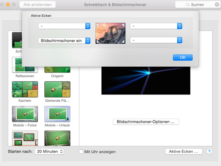 Entscheiden Sie sich für eine der Ecken und nutzen Sie dann aus dem Listenfeld den Eintrag Bildschirmschoner an. Verlassen Sie den Dialog mit OK. Wenn Sie in Zukunft den Arbeitsplatz verlassen wollen, bewegen Sie den Mauszeiger bis ganz nach außen in die von Ihnen gerade konfigurierte Ecke. Dann startet der Bildschirmschoner automatisch.