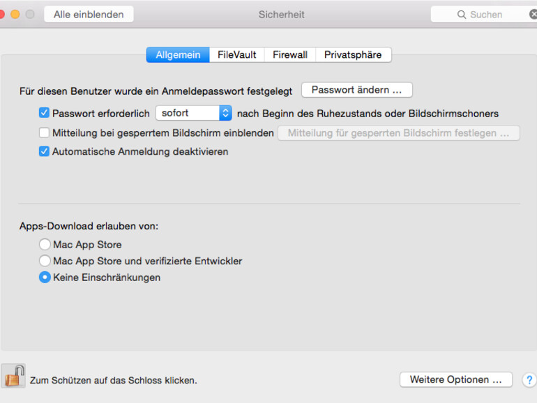 Im nächsten Schritt bearbeiten Sie die Optionen für den Bildschirmschoner so, dass dieser ein Passwort fordert, sobald er wieder beendet werden soll. Die Optionen befinden sich im Abschnitt Sicherheit der Systemeinstellungen. Hier rufen Sie sich Allgemein auf. Aktivieren Sie dort die Option Passwort erforderlich nach Beginn des Bildschirmschoners. Suchen Sie dann aus dem Listenfeld noch ein passendes Intervall aus. Für die größtmögliche Sicherheit ist sofort natürlich die beste Wahl. Falls Sie aber aus Versehen zu nahe an die aktive Ecke gekommen sind, können Sie diesen Schritt nicht mehr rückgängig machen. Deshalb dürften auch 5 Sekunden immer noch ausreichend sein.