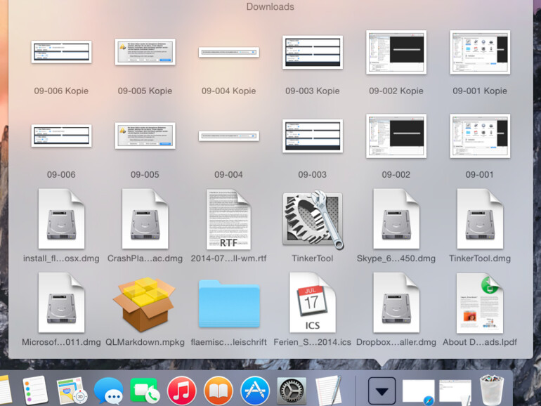 Im Dock liegen nicht nur Programme, sondern teilweise auch Ordner. So kann es ganz praktisch sein, sich den Ordner eines Projekts, an dem laufend gearbeitet wird, in das Dock zu ziehen. In einem Ordner, der auch teilweise als ein langer Trichter symbolisiert werden kann, können Sie auch scrollen.