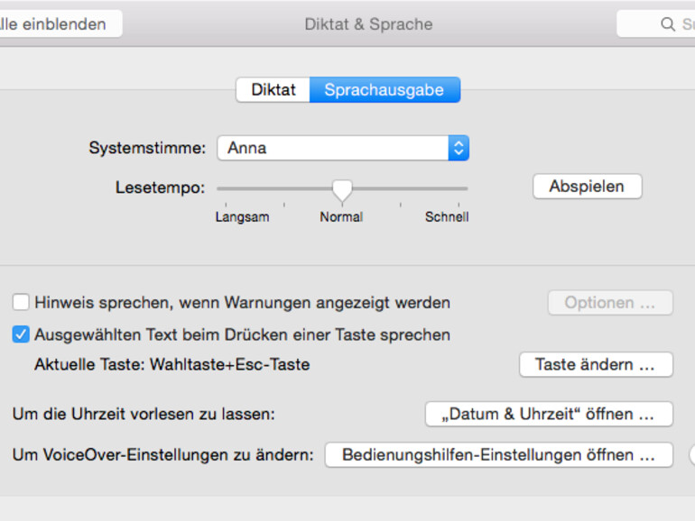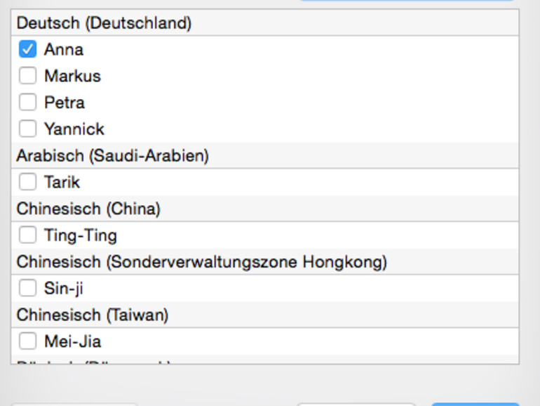Frisch nach der Installation ist „Anna" mit an Bord, die Siri zum Verwechseln ähnlich klingt. Mit einem Klick auf Abspielen hören Sie sich an, wie die Stimme klingt, und können mit dem Schieberegler das Lesetempo verändern. Wenn Sie lieber eine männliche Stimme wollen, wählen Sie aus dem Listenfeld das Kommando Anpassen.