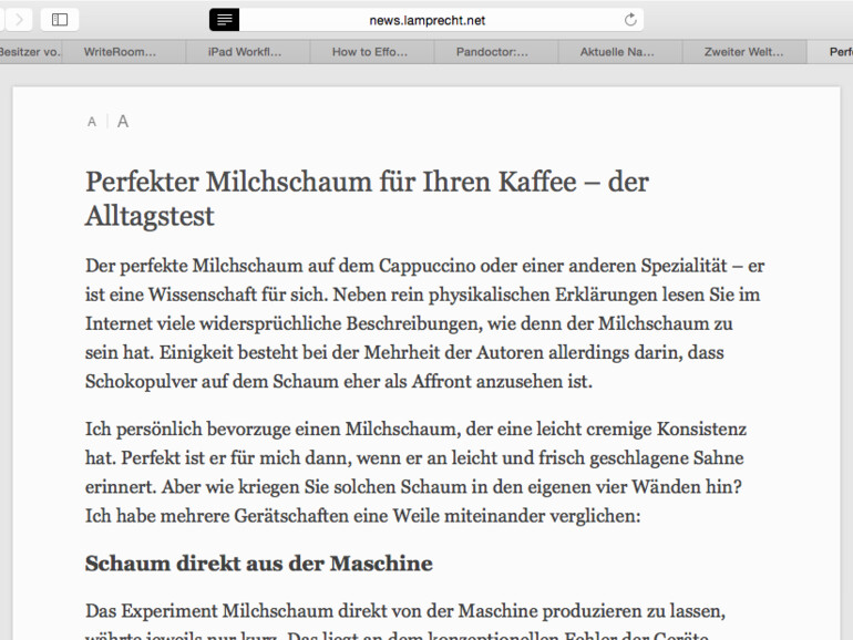 Sie nutzen Safari wie gewohnt. Wenn der Reader die Seite vereinfachen kann, erscheint direkt links neben der Adressleiste ein kleines Textsymbol. Klicken Sie darauf. Safari lädt jetzt den Text und die Bilder in einer lesefreundlichen Umgebung, ohne Werbung, ohne Navigation. Sie sehen lediglich den reinen Text sowie zwei kleine Bedienelemente, mit denen Sie die Buchstabengröße wechseln können.