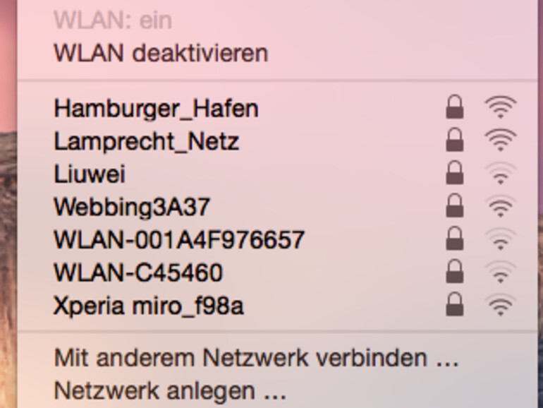2 Im Menü werden alle im Empfangsbereich befindlichen Netzwerke angezeigt. Die Zahl der Wellen hinter dem Namen spiegelt die Signalqualität wider. Klicken Sie auf den Namen des Netzwerks, mit dem Sie sich verbinden wollen.
