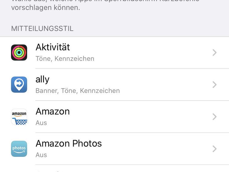 Darunter folgen die verfügbaren Mitteilungsarten, die sich je nach App etwas unterscheiden. Während Hinweistöne schnell lästig werden, hat sich das Kennzeichen am App-Symbo als dezente Information sehr bewährt.