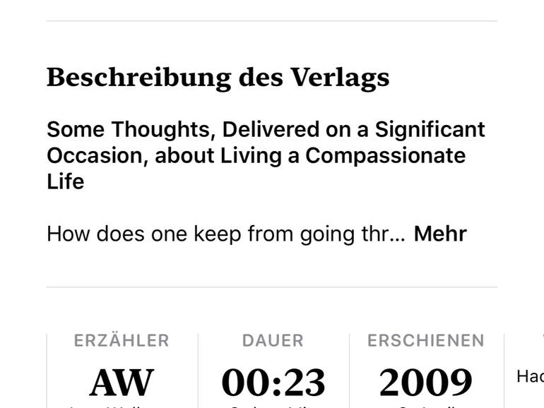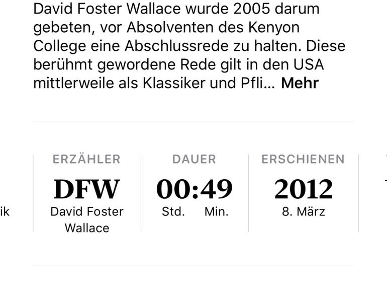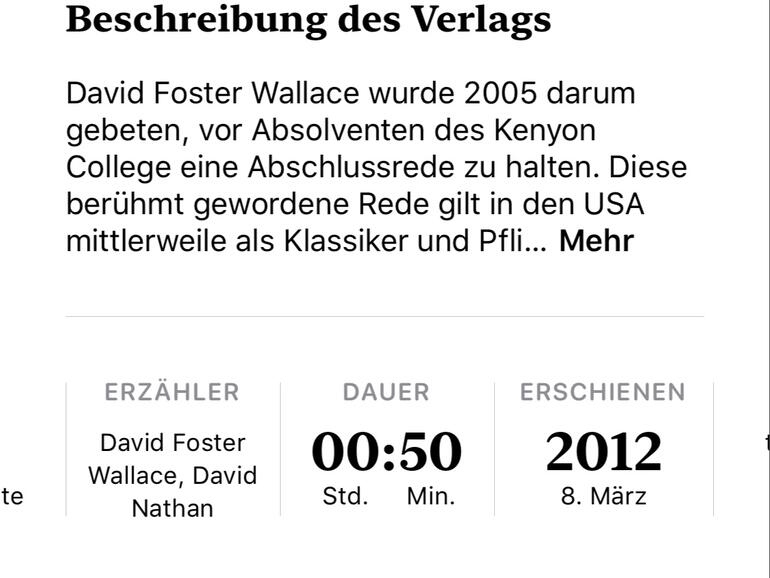 Schaut man in die Metadaten im „Book Store“ ergibt sich jedoch ein leicht anderes, vor allem aber ein verwirrendes Bild. Nummer 1 hat eine Spieldauer von 50 Minuten und als Erzähler sind sowohl David Foster Walles als auch die deutsche Sprecherlegende David Nathan hinterlegt.
