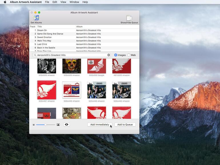 Es öffnet sich ein neues Fenster mit möglichen Bildern – nimm das größte (am besten 500x500 Pixel oder größer), klicke dann auf Add „Immediately" und es wird automatisch zu den Liedern hinzugefügt, die Teil deiner iTunes-Mediathek sind.