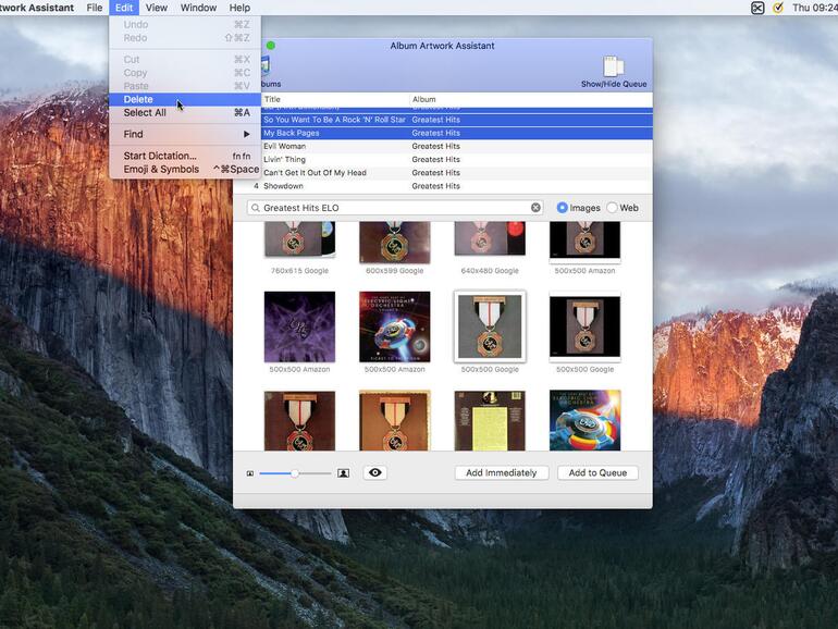 Wenn der Albumtitel weit verbreitet ist, musst du vielleicht einen anderen Begriff, zum Beispiel den Künstler, hinzufügen. Passe auch bei Titeln wie „Greatest Hits“ auf. Wenn du Titel nicht im Album Artwork Assistant brauchst, gehe zu Bearbeiten > Löschen.