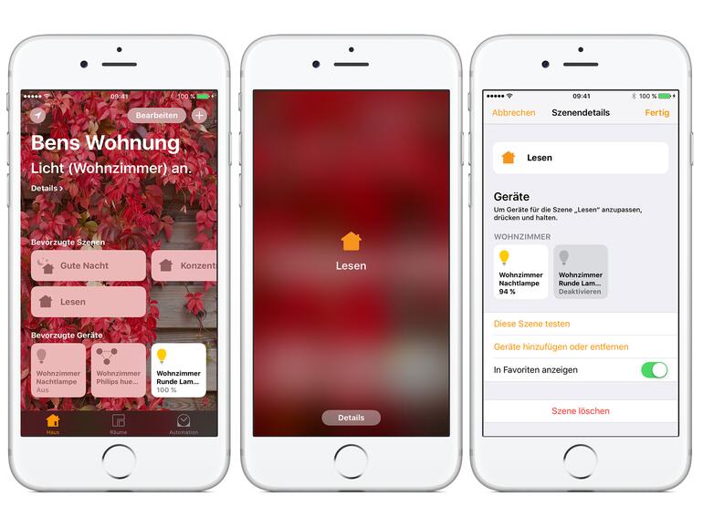 Öffnen Sie dazu zunächst erstmal die Home-App auf Ihrem iPhone oder iPad. Gleich zu Beginn sehen Sie Ihre bevorzugten Szenen. Halten Sie den Finger kurz darauf gedrückt, um den Szenennamen und das Icon zu sehen. Tippen Sie darunter auf „Details“.