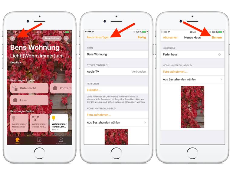 Dazu öffnen Sie die Home-App und tippen oben links auf den Richtungspfeil. Gleich links tippen Sie auf „Haus hinzufügen“. Nun geben Sie noch einen Namen ein, beispielsweise „Ferienhaus“. Dann tippen Sie auf „Sichern“. Sie können jetzt noch Personen einladen, ein anderes Hintergrundfoto festlegen und Notizen für die eingeladenen Personen hinterlassen. Ein Fingertipp auf „Fertig“ und schon haben Sie ein neues Haus zu Ihrer Home-App hinzugefügt.