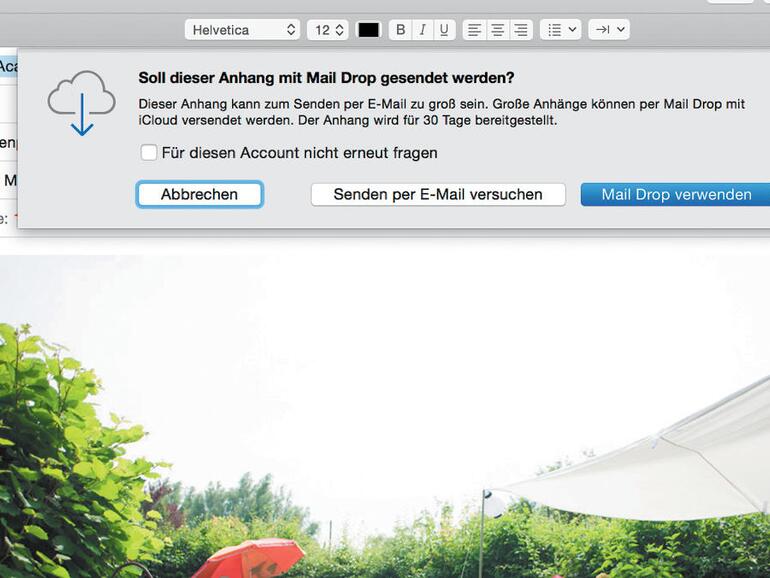 Mail bietet dir dann die Option an, Mail Drop zu verwenden. Der Anhang (maximal 5 GB) wird dann aus der Mail entfernt und in die iCloud geladen. Verschickt wird lediglich ein Link zu der Datei. Diese wird 30 Tage lang gespeichert und zählt nicht gegen dein Speicherkontingent. Dennoch gibt es ein Limit von 1 TB innerhalb von 30 Tagen. Weitere Limits listet Apple hier: support.apple.com/de-de/HT203093