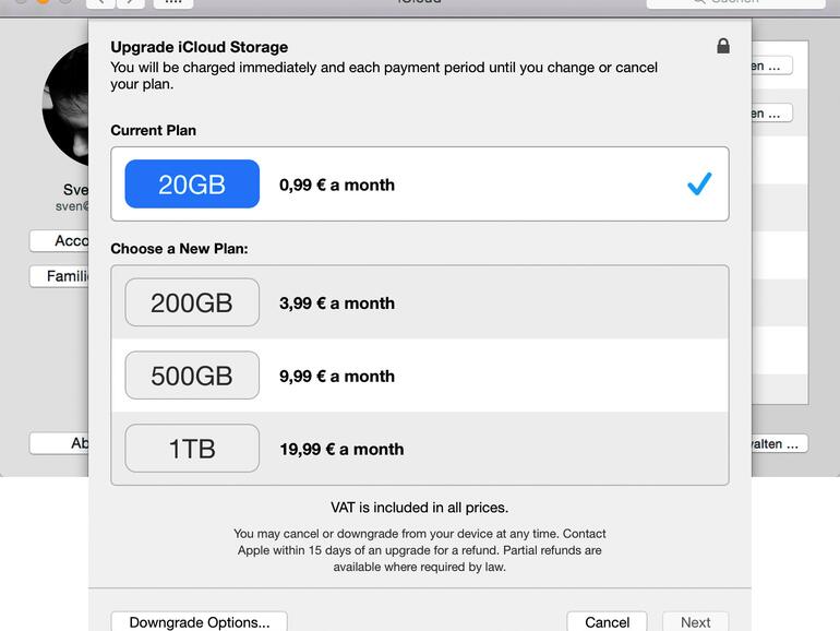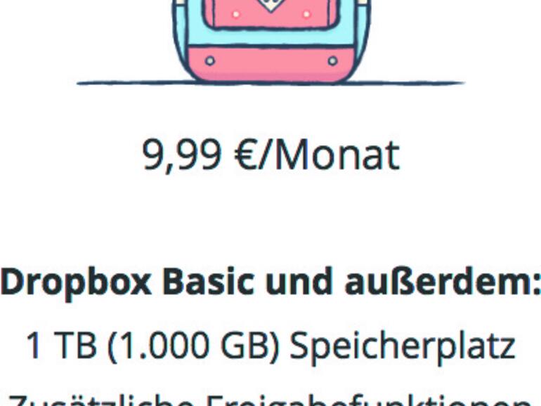 Die Basis-Version von Dropbox schenkt Ihnen 2 GB zur Nutzung. Weiteren Speicherplatz erhalten Sie über Einladungen für neue Nutzer oder ähnliche Werbe-Aktionen. Die kostenpflichtige Pro-Version staffelt sich nur in ein einzigen Tarif. Für 9,99 Euro monatlich erhalten Sie 1 TB für Ihre Daten und Dokumente. Anders als iCloud richtet sich Dropbox nicht nur an Privatpersonen, sondern auch kleine Unternehmen und Teams. Diese erhalten für 12 Euro pro Monat 5 TB für 5 Nutzer. Den Speicher können Sie darüber hinaus erweitern.