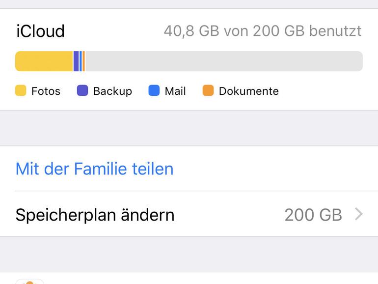 Als weitere Möglichkeit ist das Teilen des iCloud-Speicherplans über die Familienfreigabe hinzugekommen. Dabei schließt ein Mitglied ein größeres Speicher-Abo ab und stellt dieses dann den anderen zur Verfügung. Das heißt, alle nutzen den gebuchten Speicherplatz gemeinsam. Schon in einer vierköpfigen Familien ist ein 200-Gigabyte-Plan für 2,99 Euro pro Monat rund einen Euro günstiger als vier kleine Konten à 50 Gigabyte. Außerdem wird der Platz effektiver genutzt. Braucht ein Mitglied weniger, steht den anderen mehr Platz zur Verfügung. Im Folgenden zeigen wir, wie Sie den gemeinsamen Speicherplatz aktivieren.