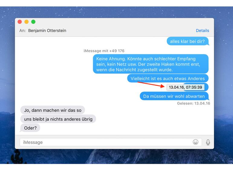 Bewegen Sie den Mauszeiger über eine der Sprachblasen und lassen Sie ihn für ein bis zwei Sekunden darüber stehen. iMessage wird Ihnen dann das Datum sowie die genaue Uhrzeit einblenden.