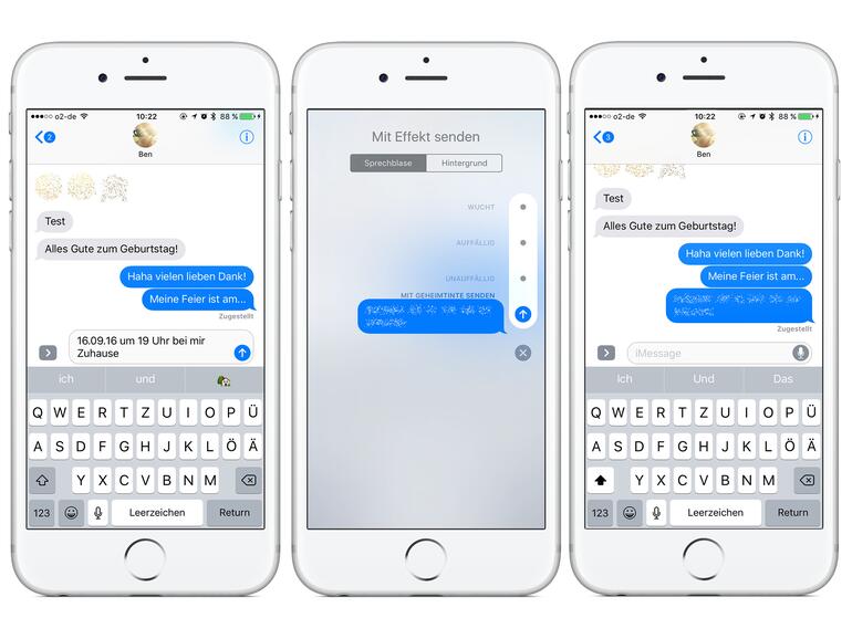 Neben der Geheimtinte lassen sich noch weitere Effekte ausführen, dazu gehören „leise" und „laute" Nachrichten sowie ein wuchtiger Effekt, der die Nachricht auf das Display wirft. Um sich mit den Neuerungen von iMessage in iOS 10 vertraut zu machen, sollten Sie die verschiedenen Effekte ruhig einmal ausprobieren. Beachten Sie aber, dass die Effekte nun von Nutzern empfangen werden können, die Ihr Gerät bereits auf iOS 10 aktualisiert haben.