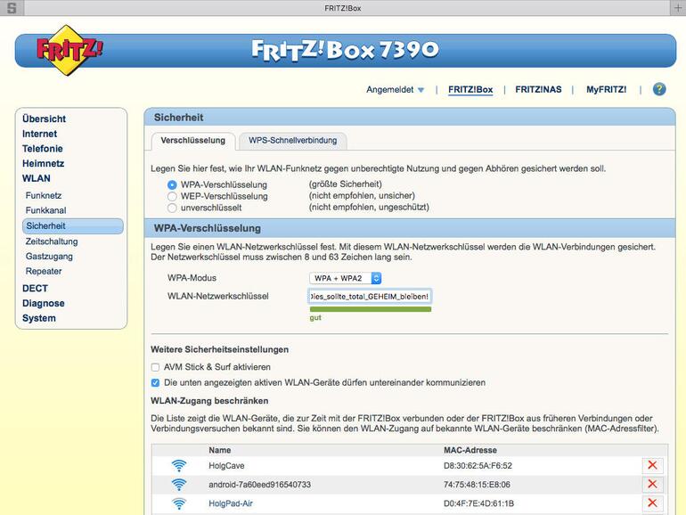 Im WLAN-Bereich der Benutzeroberfläche lassen sich die verschiedenen Frequenzen aktivieren und Namen vergeben. Es spricht nichts dagegen, eindeutige Namen zu benutzen, unter denen einen auch die Nachbarn finden. Unter „Sicherheit“ sollte man unbedingt die WPA-Verschlüsselung aktivieren und einen langen, komplexen Schlüssel eingeben, der die maximalen 63 Zeichen möglichst weit ausnutzt. Wer möchte, kann den Zugang zum WLAN auf bestimmte Geräte beschränken und andere ausschließen, was erfahrungsgemäß spätestens dann Probleme macht, wenn man jemand mit einem neuen Gerät kommt. Hierfür lässt sich aber ein Gastnetzwerk mit einem eigenen Namen aufspannen, in dem sich der Zugang zusätzlich beschränken lässt.