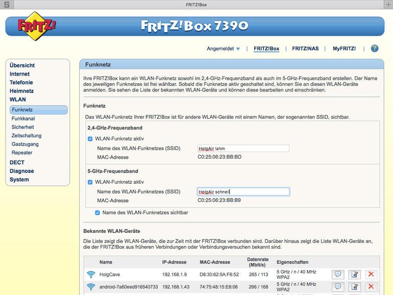 Leider spielen aber viele ältere Smartphones und vor allem Smart-Home-Geräte hier nicht mit: Manche unterstützen zwar 802.11n, aber nur im 2,4-GHz-Bereich oder sogar nur noch langsamere Standards. Und auch wenn man selbst nur Geräte für 802.11n besitzt, kommt todsicher irgendwann jemand mit seinem alten Notebook oder Smartphone zu Besuch, der gern ins Netz möchte. Ein Vorteil der Fritzboxen, den nicht alle Konkurrenzmodelle teilen, ist deren Fähigkeit, beide Frequenzbereiche getrennt unter verschiedenen Namen zu betreiben.