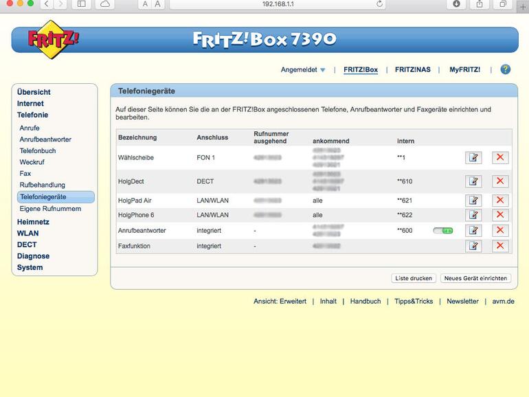 6 Im Telefoniebereich lassen sich alle Arten von Endgeräten eintragen, wozu es ebenfalls einen Assistenten gibt. Dazu zählen je nach Modell analoge Geräte, ISDN- und schnurlose Telefone oder Smartphones mit passender App im WLAN. Zu jedem Gerät darf man angeben, bei welcher Nummer es klingeln und welche für abgehende Anrufe genutzt werden soll. Damit reicht die Telefonzentrale auch für mehrere Personen mit getrennten Nummern. Außerdem lassen sich mehrere Anrufbeantworter und ein Faxempfänger aktivieren. Später finden sich in diesem Bereich auch Anruflisten, Rumumleitung und einiges mehr.