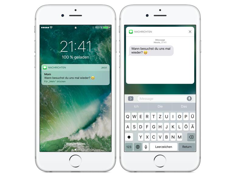 Geht bei Ihnen etwa eine neue Benachrichtigung auf Ihrem Sperrbildschirm ein, dann reicht bereits ein fester Druck auf das Display, um weitere Informationen anzuzeigen. Drücken Sie beispielsweise fest auf eine eingegangene Nachricht, dann können Sie direkt auf diese antworten und sehen sogar einen Teil des Nachrichtenverlaufs. Je nach App können andere solcher interaktiven Funktionen zum Vorschein kommen, wenn man 3D Touch nutzt.