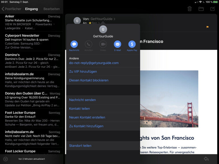 Wem das Stummschalten von Mail-Konversationen nicht ausreicht, erhält nun eine weitere Möglichkeit, um für Ruhe zu sorgen. Denn wie schon bei Textnachrichten ist auch nicht jede E-Mail gleichermaßen gern gesehen. Vor allem Spam und nervige Absender, die nicht korrekt gefiltert werden, sind vielen Nutzern ein Dorn im Auge. In iPadOS sowie iOS 13 integrierte Apple daher eine neue Sperre in Mail, mit der Sie beliebige Absender blockieren und die Nachrichten direkt in den Papierkorb verschieben – und das über alle Apple-Geräte hinweg. Wählen Sie dazu eine E-Mail sowie deren Absender aus, um ihn dann erneut anzutippen. Danach wählen Sie „Diesen Kontakt blockieren“ aus und bestätigen Ihre Eingabe ein weiteres Mal.