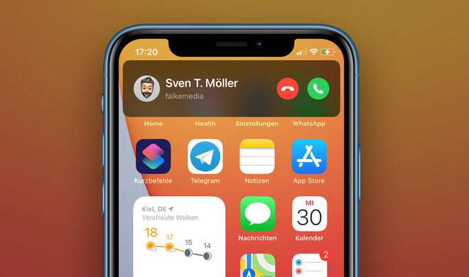 Eingehende Anrufe blockieren in iOS 14 nicht mehr den gesamten Bildschirm, sondern erscheinen als dezentes Banner ähnlich einer Push-Mitteilung. Tippst du darauf, gelangst du zur gewohnten Vollbild-Ansicht. Du kannst den Anruf schnell stummschalten, indem du den Banner nach oben wischst.