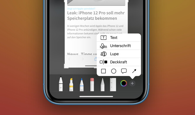 Um den Bildschirm-inhalt zu fotografieren, drücke -bei iPhones mit Face ID gleichzeitig die Power- und die Lauter-taste respektive die Power- und die Home-taste bei Modellen mit Touch ID. Tippst du dann unten links auf die Miniatur, kommst du in den Bearbeiten--Bild-schirm. Neu ist hier die Möglichkeit, die Deckkraft zu verändern.